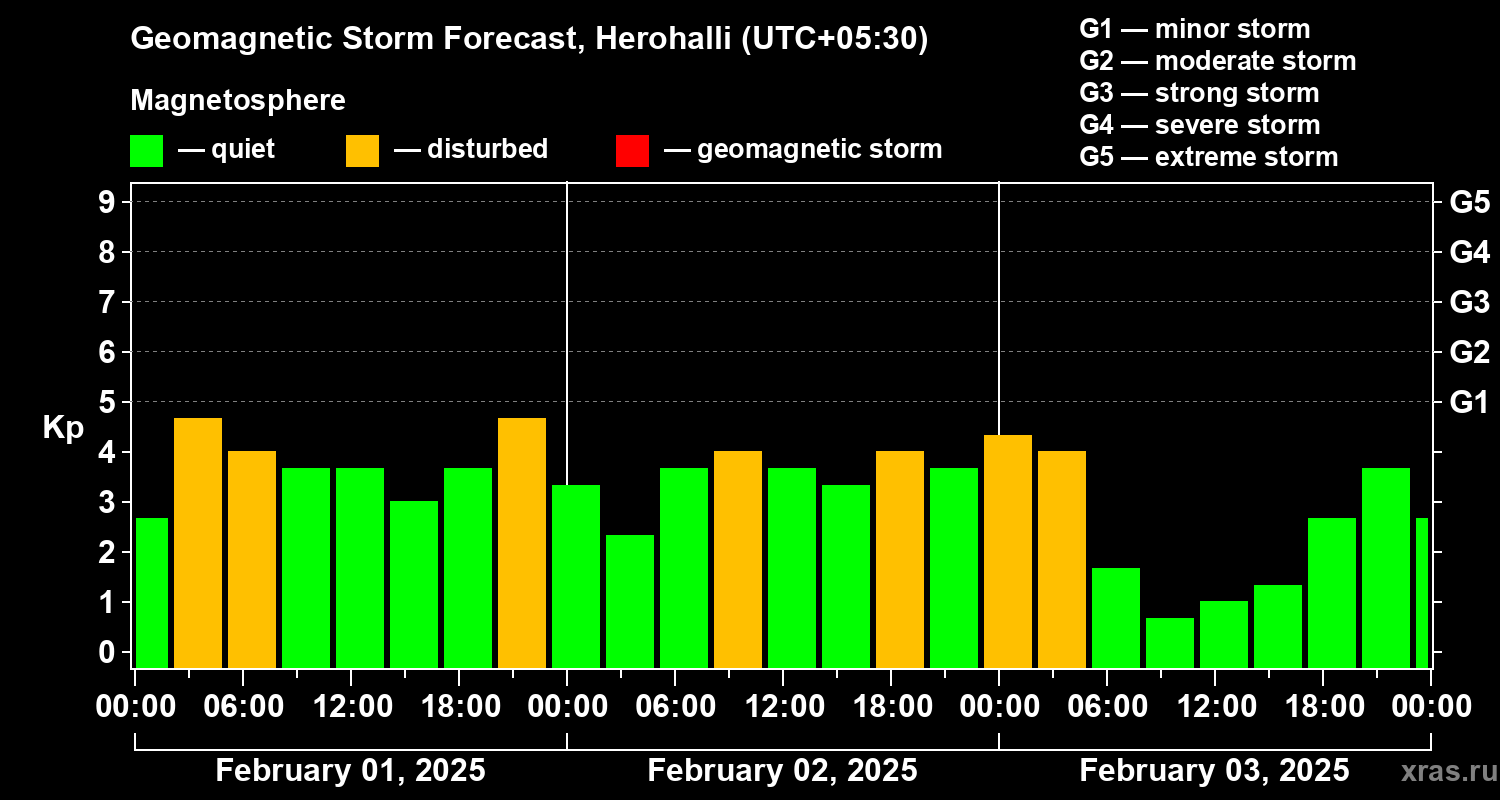 Geomagnetic storm forecast in Herohalli for Feb 01, 2025