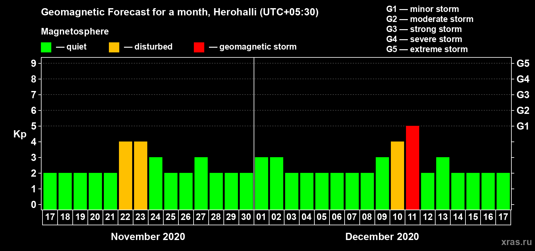 Geomagnetic storm forecast in Herohalli for Nov 17, 2020