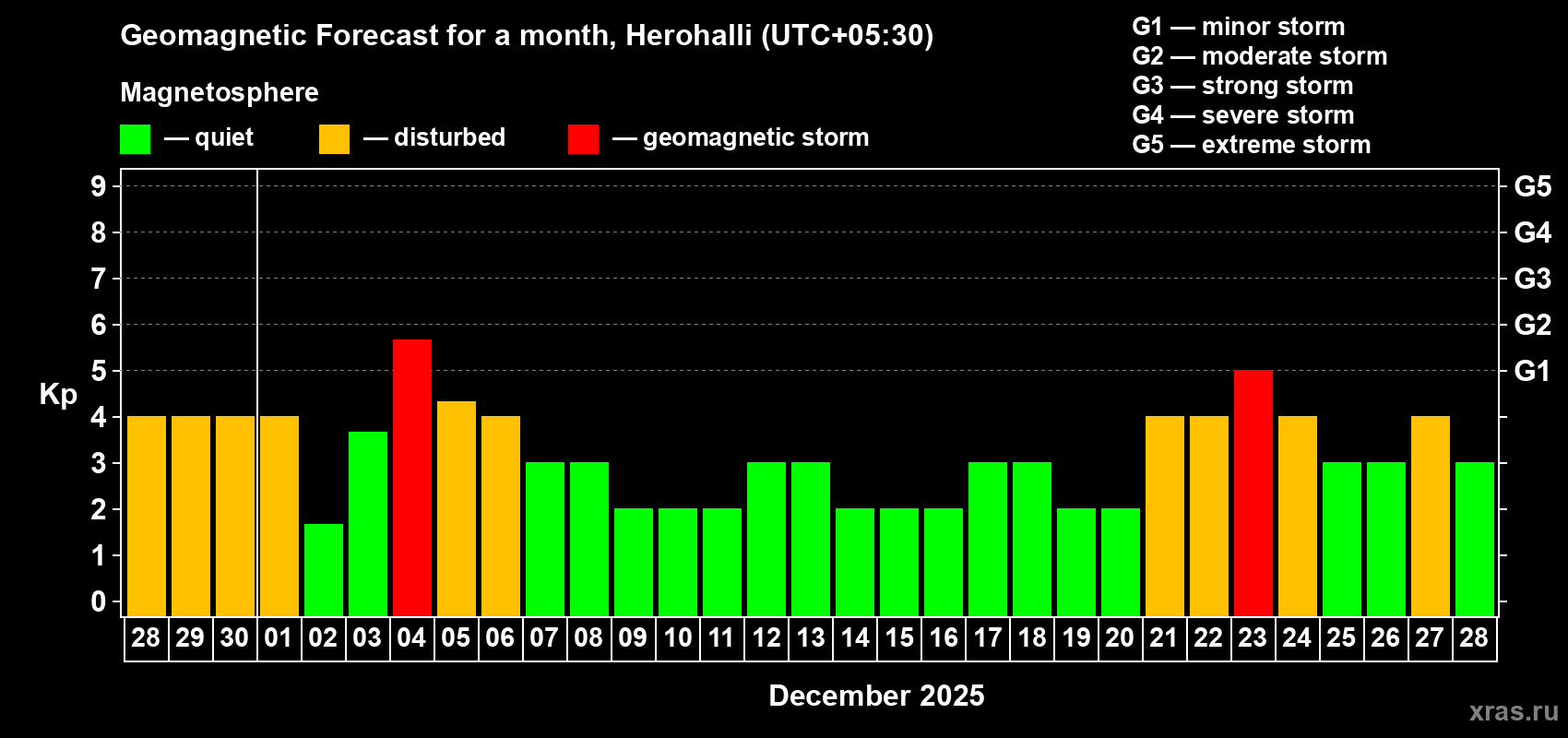Geomagnetic storm forecast in Herohalli for Nov 28, 2025