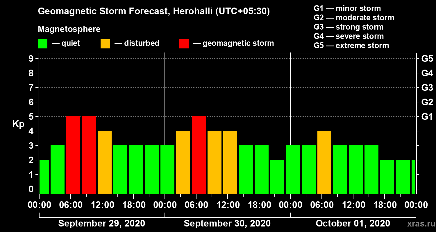 Geomagnetic storm forecast in Herohalli for Sep 29, 2020