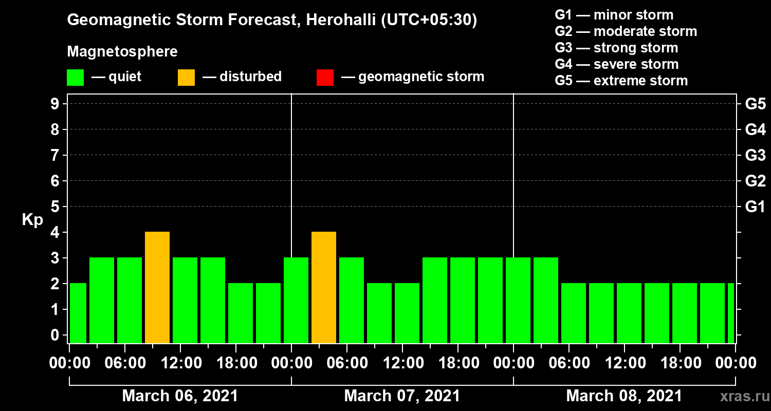Geomagnetic storm forecast in Herohalli for Mar 06, 2021