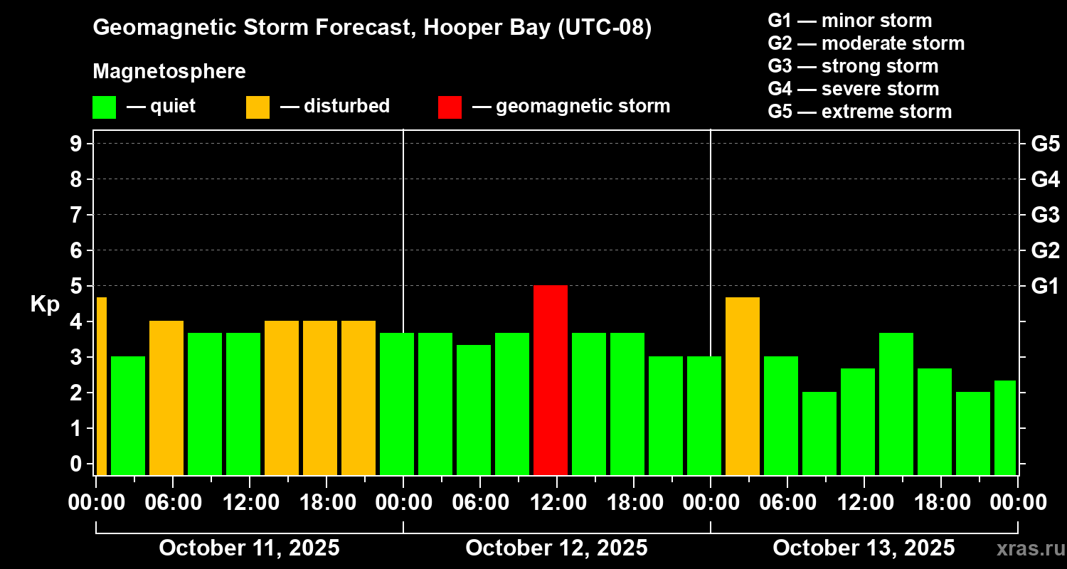 Geomagnetic storm forecast in Hooper Bay for Oct 11, 2025