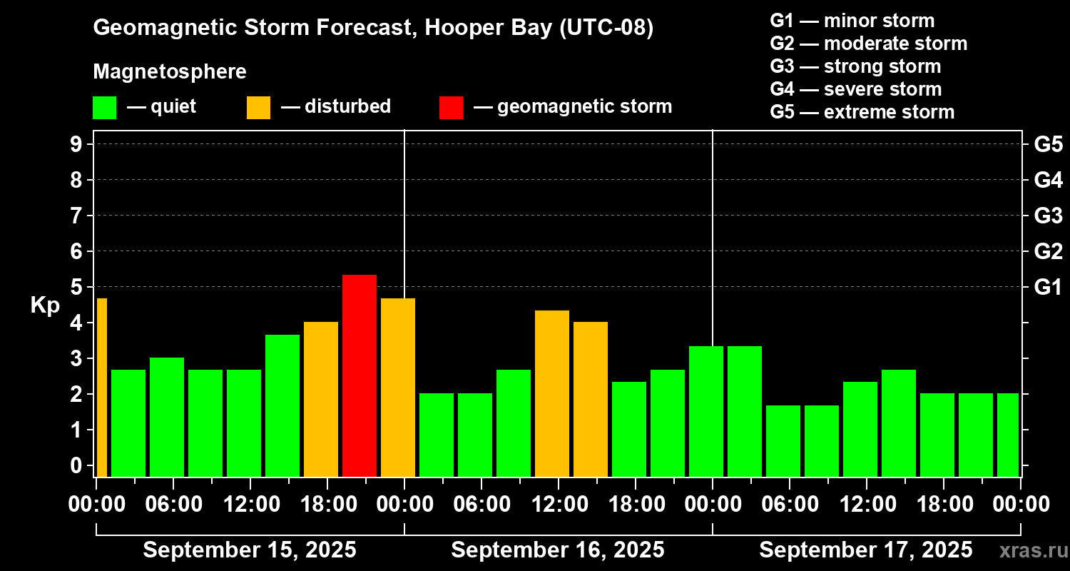 Geomagnetic storm forecast in Hooper Bay for Sep 15, 2025