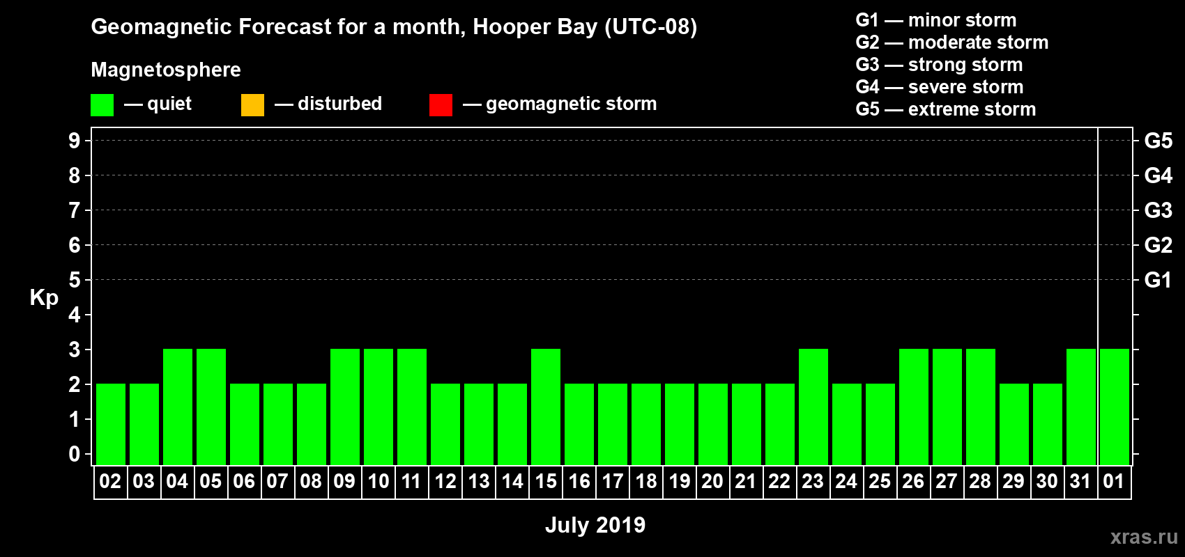 Geomagnetic storm forecast in Hooper Bay for Jul 02, 2019
