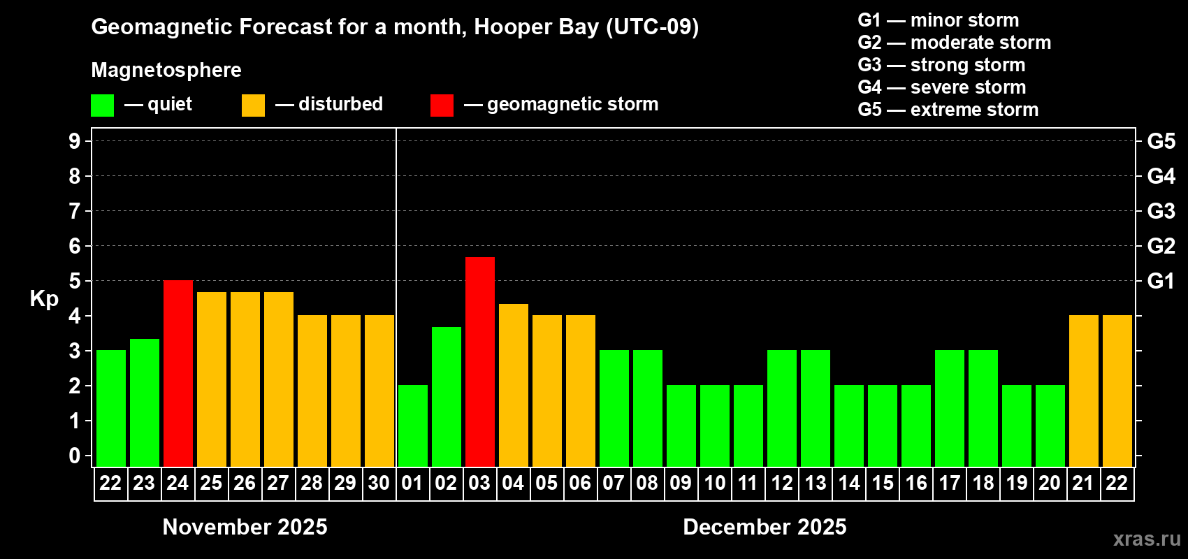 Geomagnetic storm forecast in Hooper Bay for Nov 22, 2025