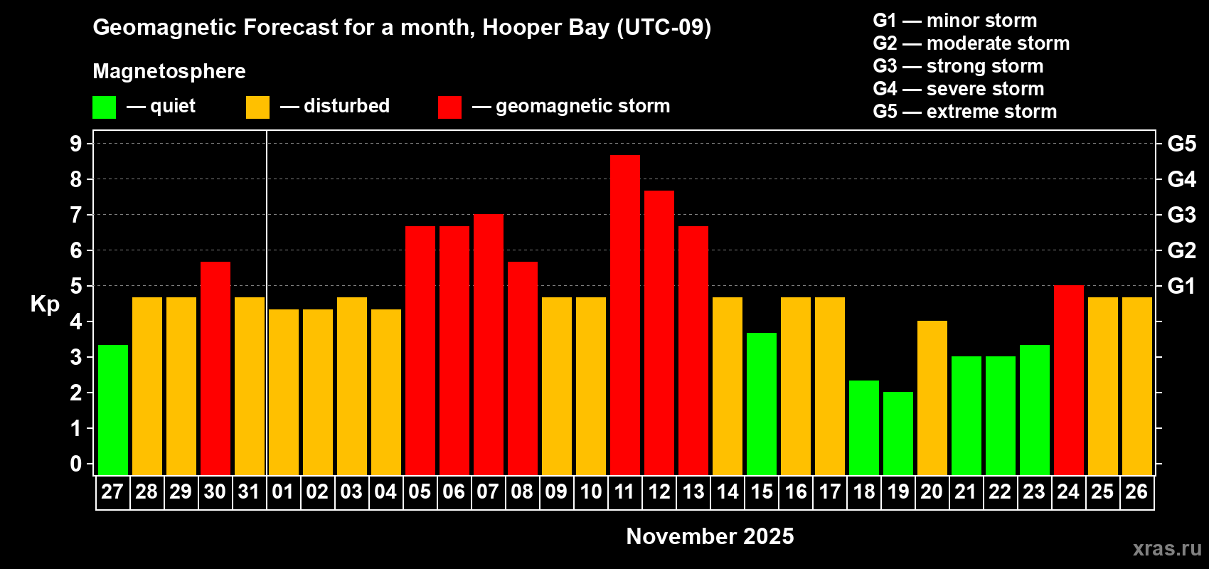 Geomagnetic storm forecast in Hooper Bay for Oct 27, 2025