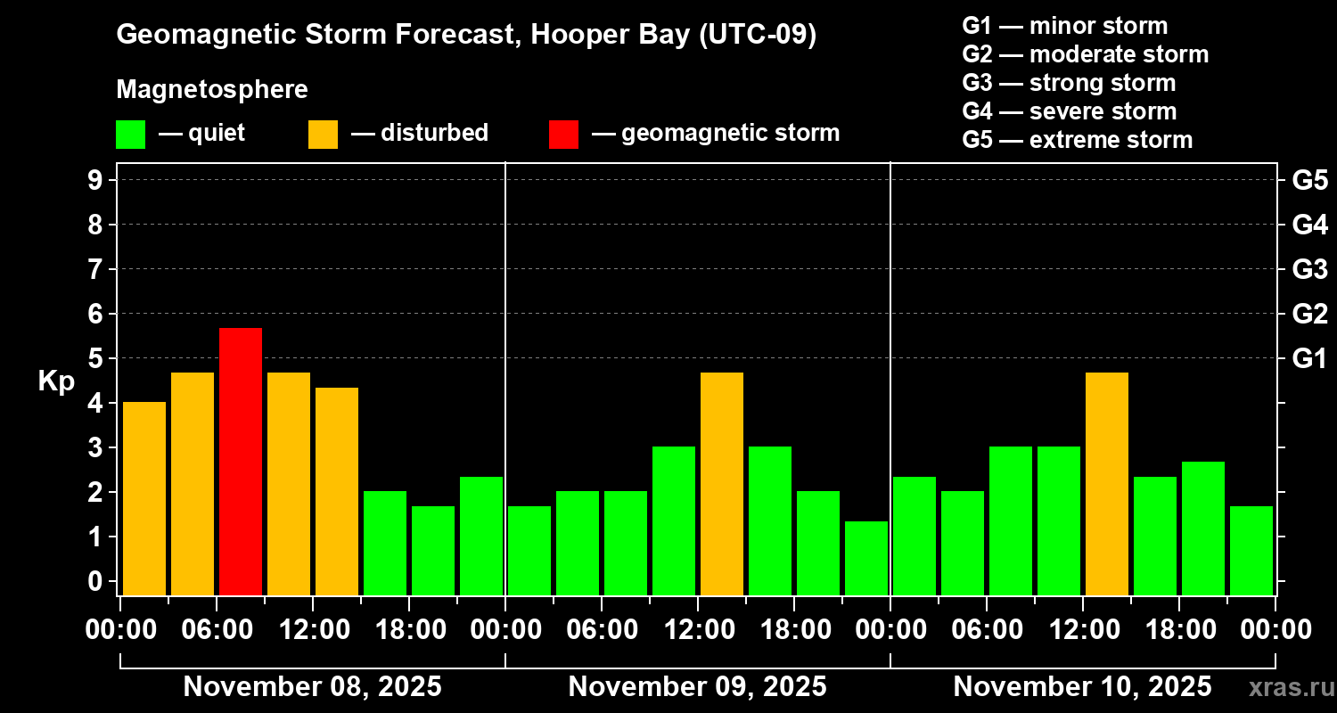 Geomagnetic storm forecast in Hooper Bay for Nov 08, 2025