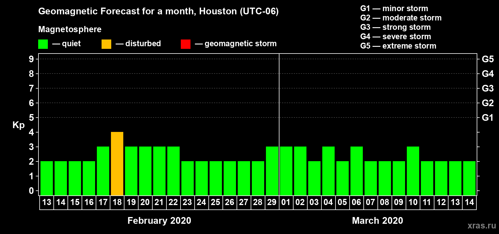 Geomagnetic storm forecast in Houston for Feb 13, 2020