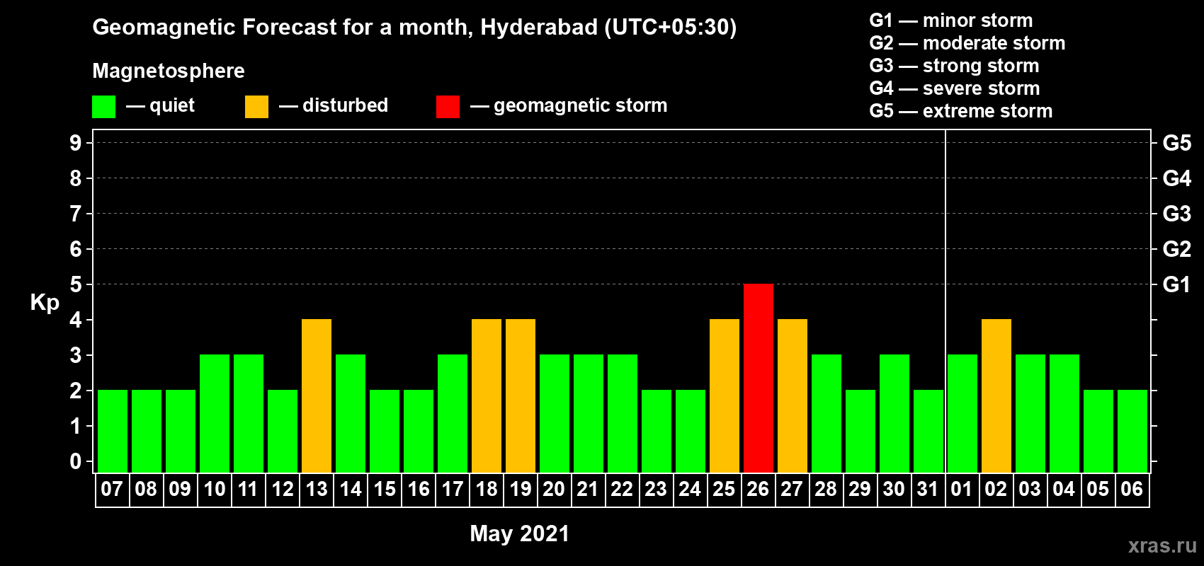 Geomagnetic storm forecast in Hyderabad for May 07, 2021