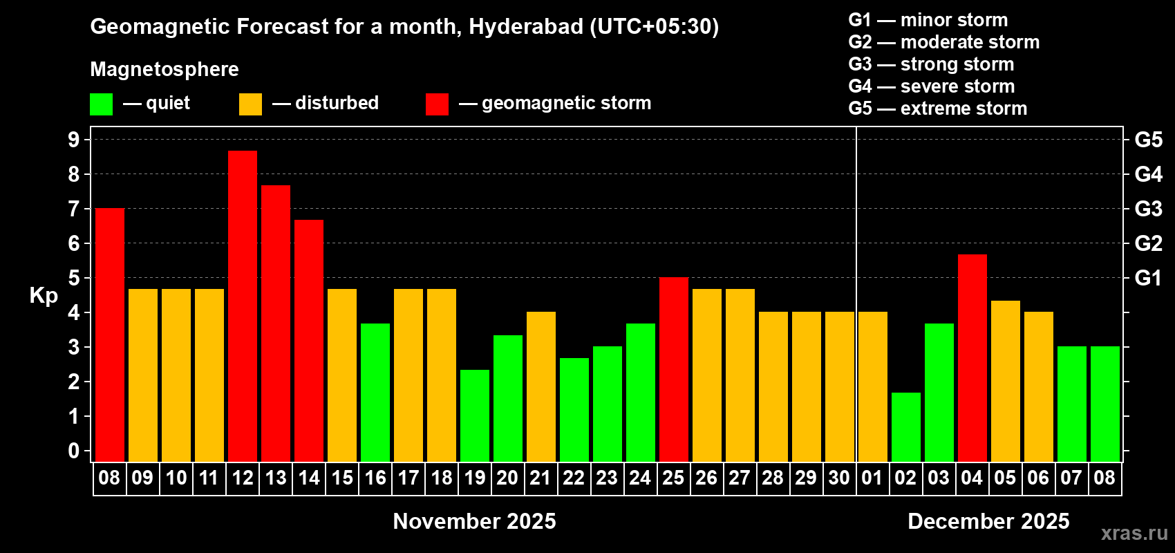 Geomagnetic storm forecast in Hyderabad for Nov 08, 2025