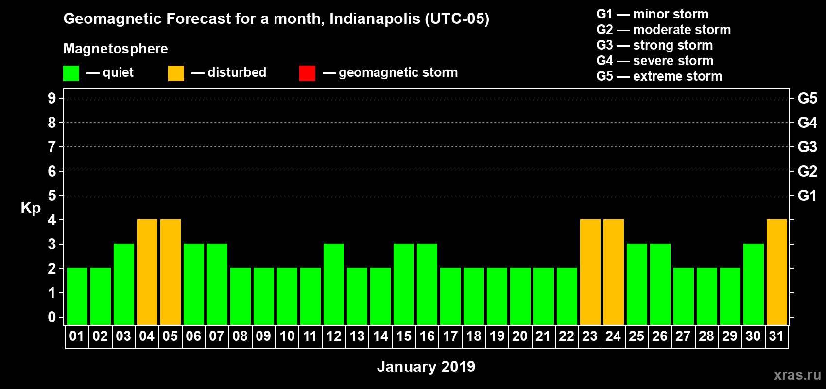 Geomagnetic storm forecast in Indianapolis for Jan 01, 2019