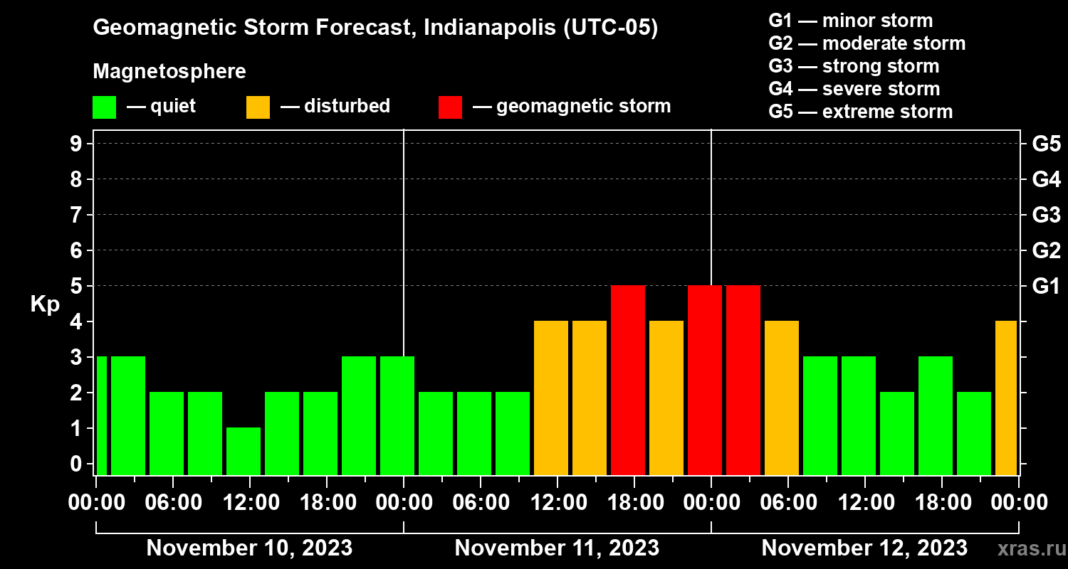 Geomagnetic storm forecast in Indianapolis for Nov 10, 2023