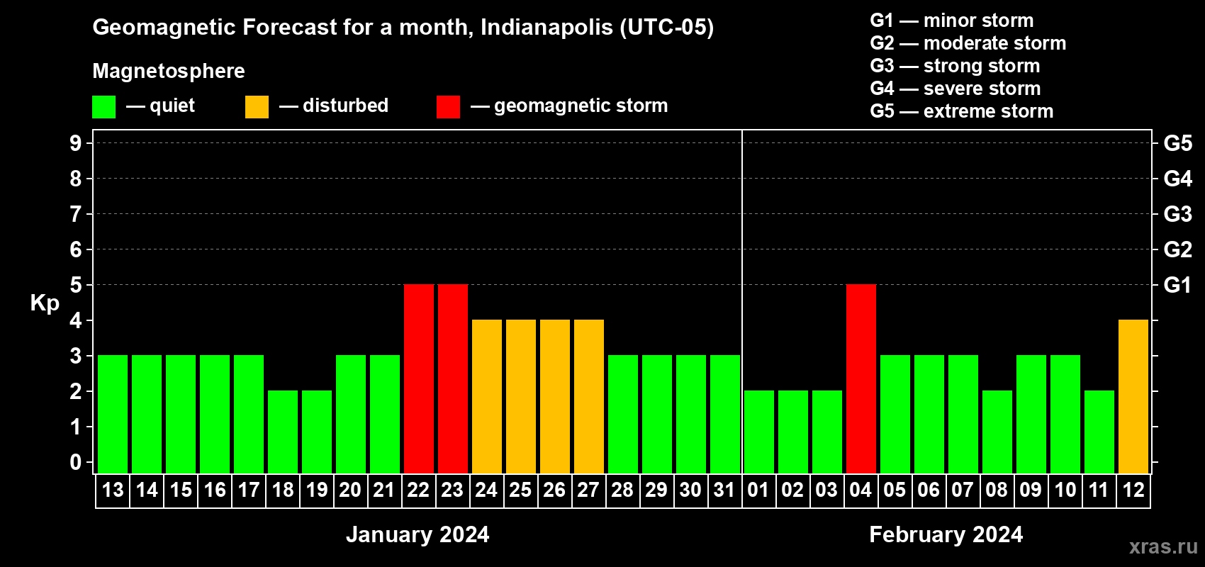 Geomagnetic storm forecast in Indianapolis for Jan 13, 2024