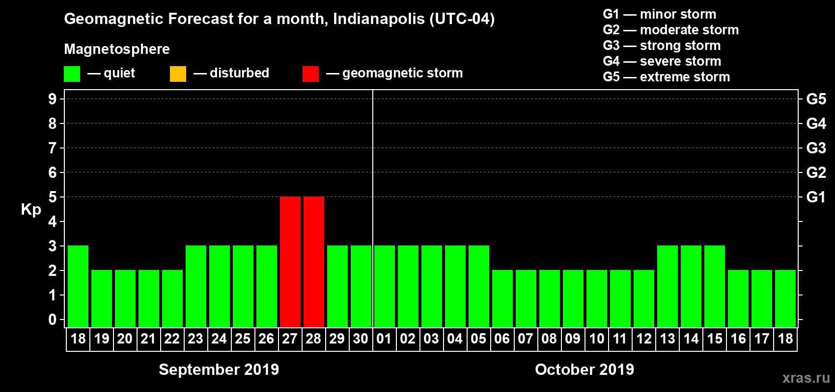 Geomagnetic storm forecast in Indianapolis for Sep 18, 2019