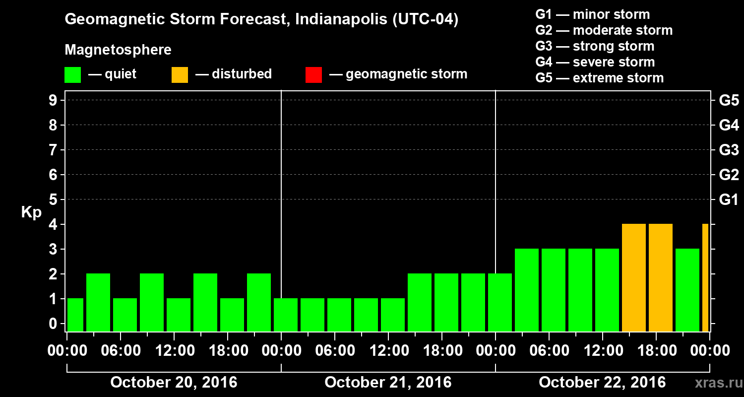 Geomagnetic storm forecast in Indianapolis for Oct 20, 2016