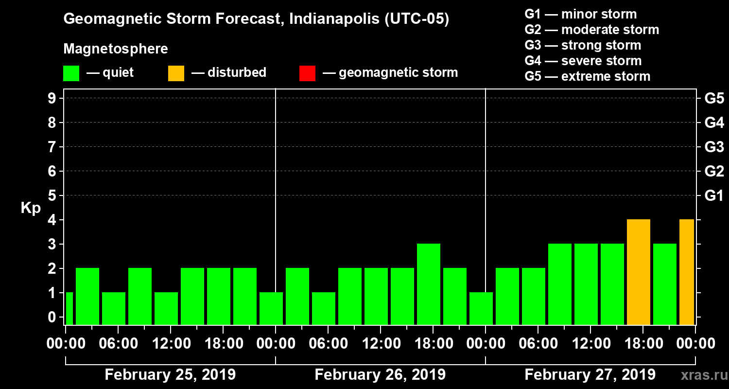 Geomagnetic storm forecast in Indianapolis for Feb 25, 2019