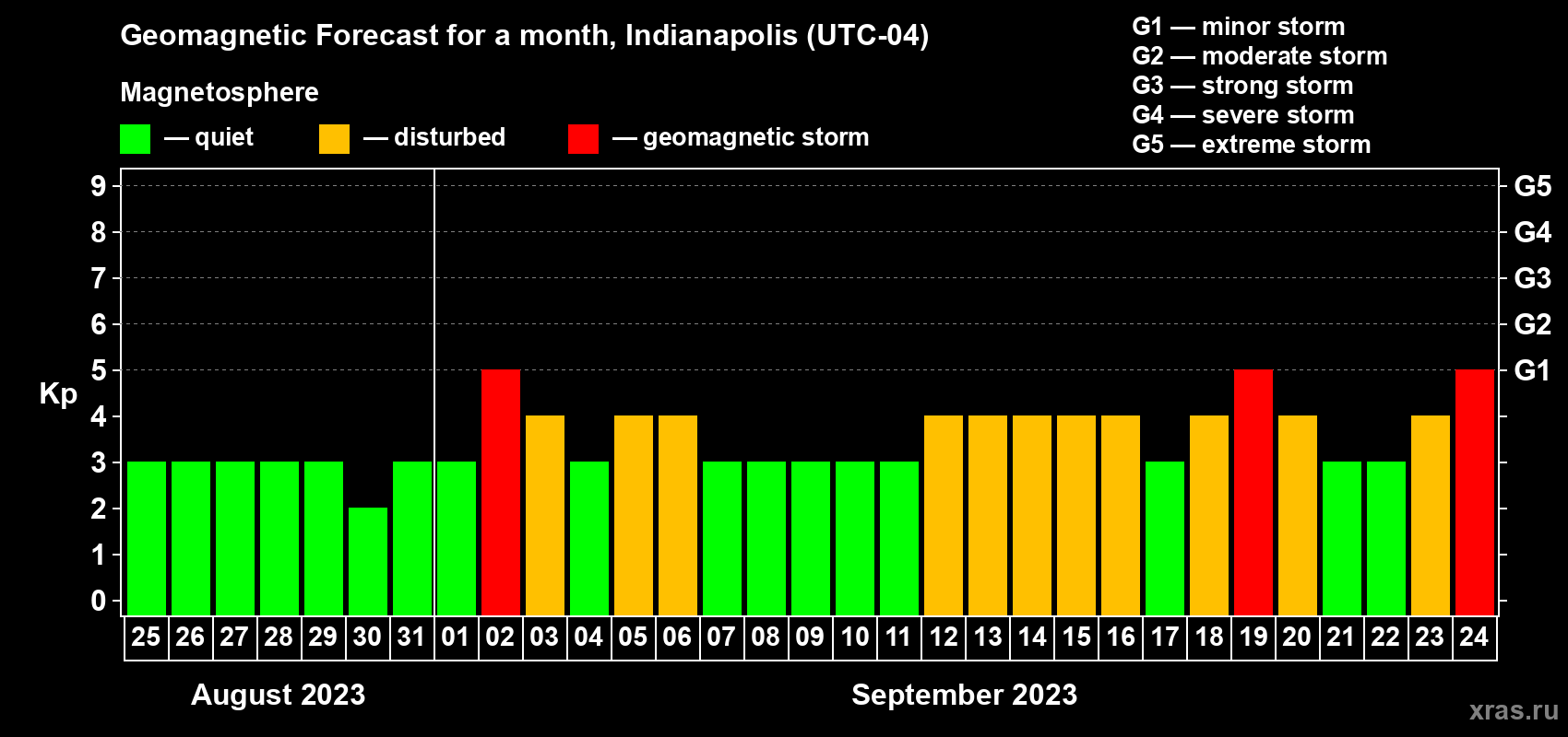 Geomagnetic storm forecast in Indianapolis for Aug 25, 2023