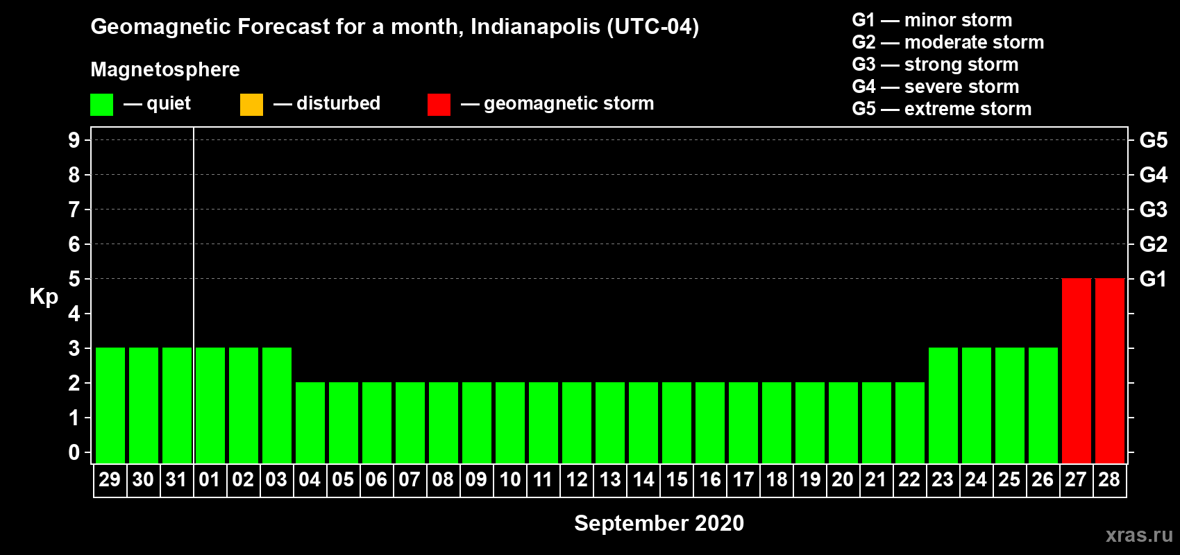 Geomagnetic storm forecast in Indianapolis for Aug 29, 2020