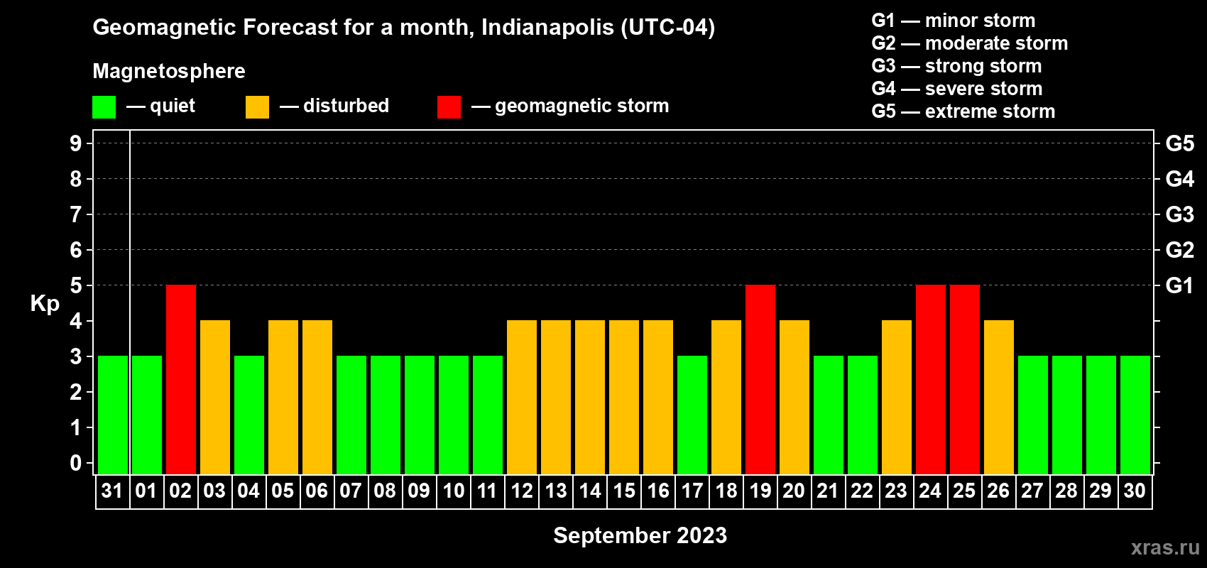 Geomagnetic storm forecast in Indianapolis for Aug 31, 2023