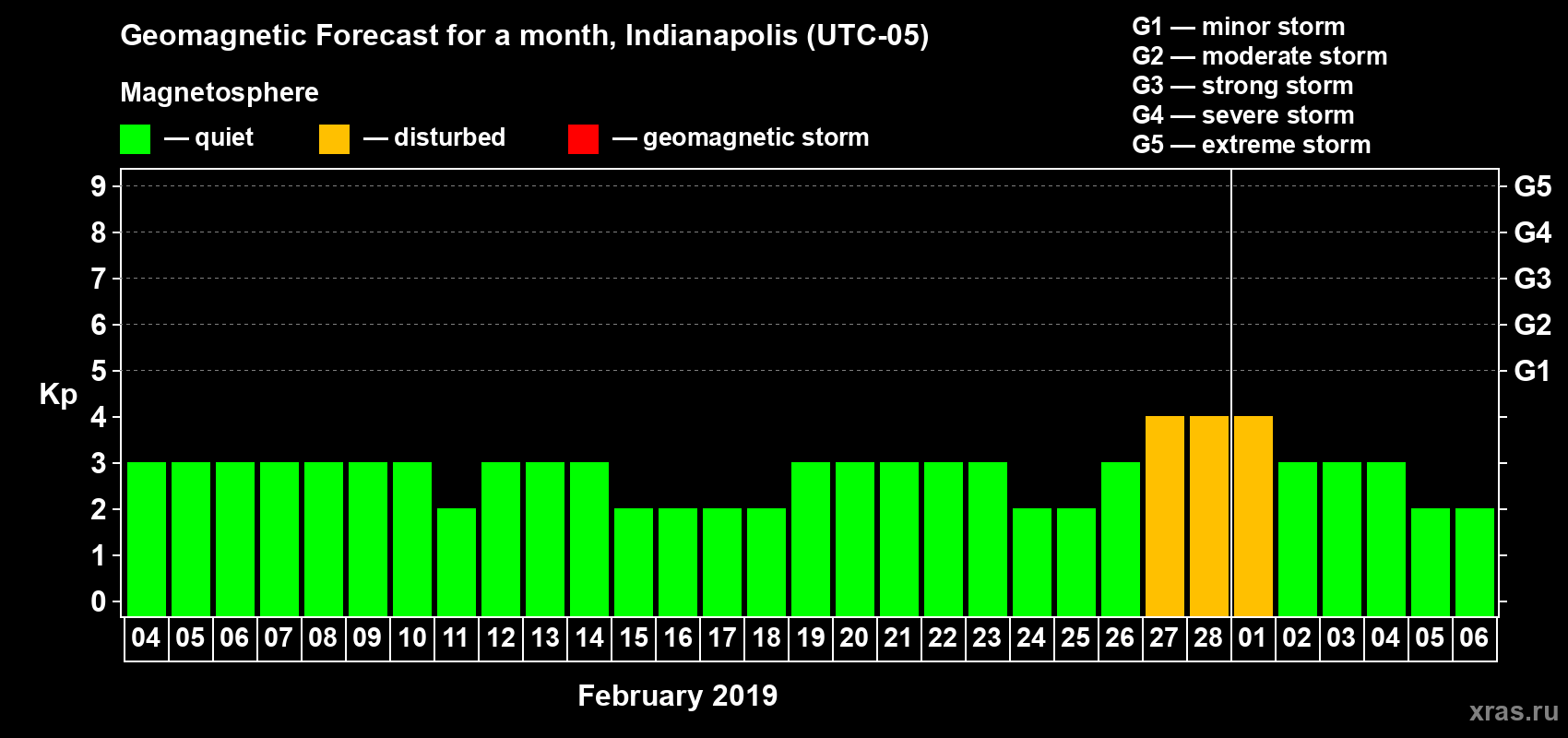 Geomagnetic storm forecast in Indianapolis for Feb 04, 2019
