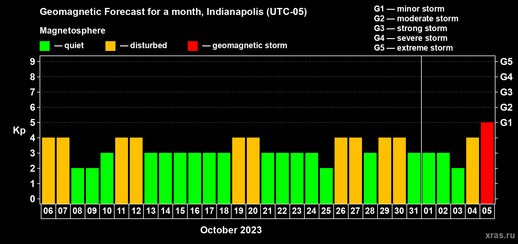 Geomagnetic storm forecast in Indianapolis for Oct 06, 2023
