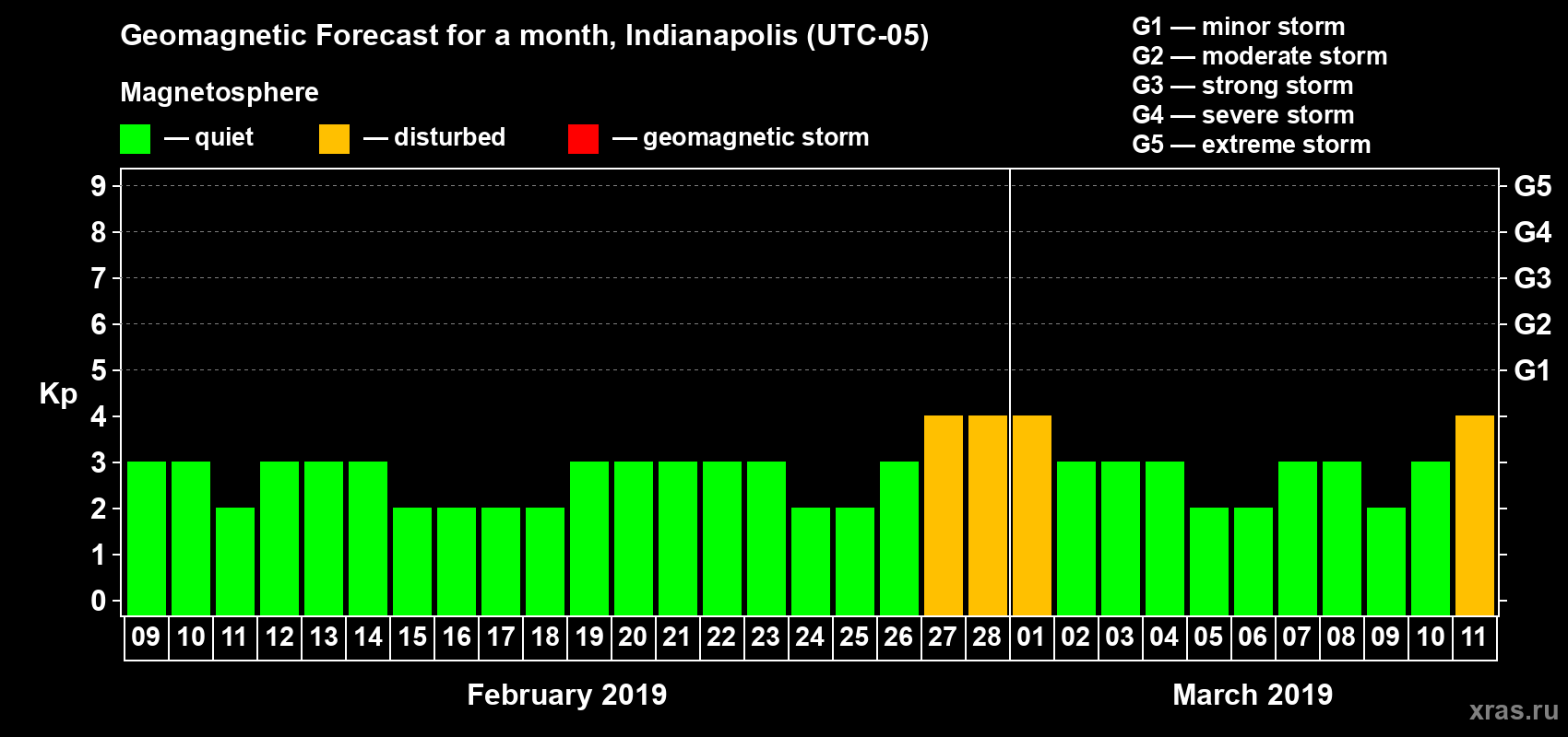 Geomagnetic storm forecast in Indianapolis for Feb 09, 2019
