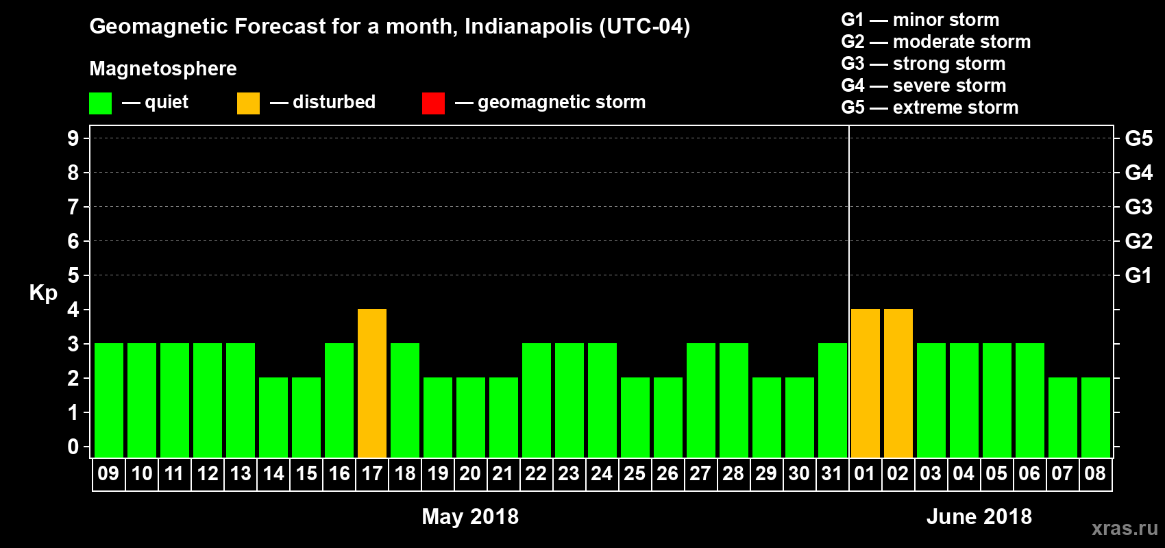 Geomagnetic storm forecast in Indianapolis for May 09, 2018