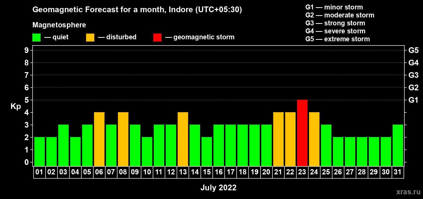 Geomagnetic storm forecast in Indore for Jul 01, 2022