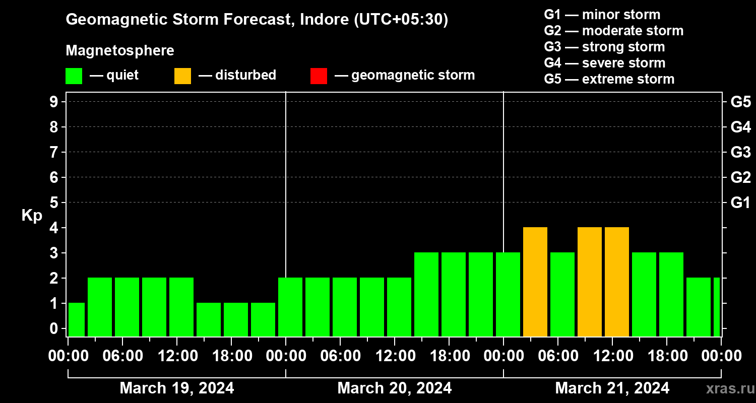 Geomagnetic storm forecast in Indore for Mar 19, 2024