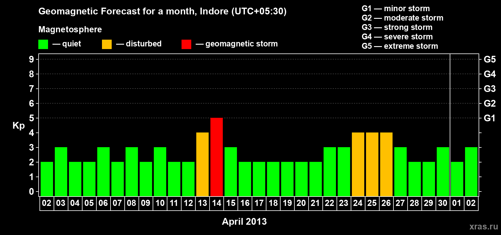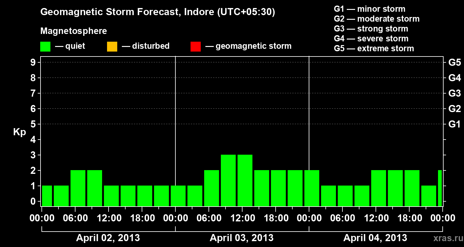 Geomagnetic storm forecast in Indore for Apr 02, 2013