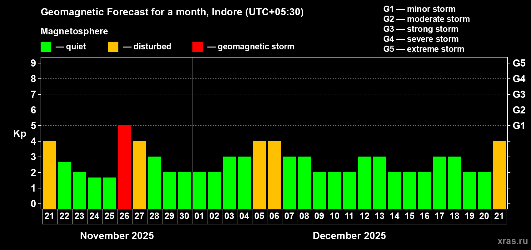 Geomagnetic storm forecast in Indore for Nov 21, 2025