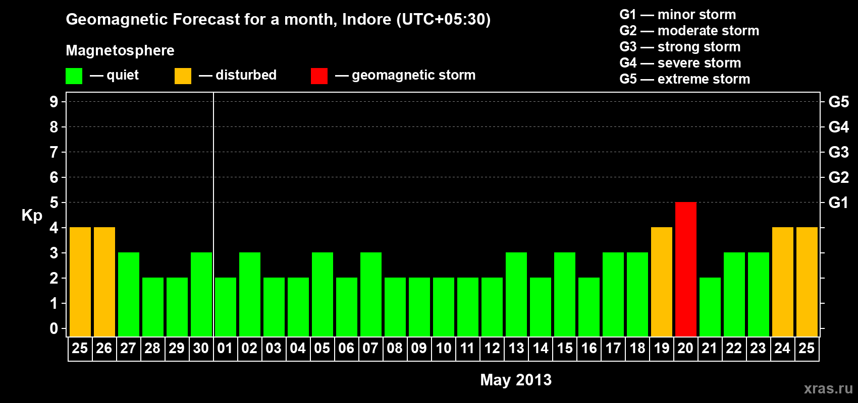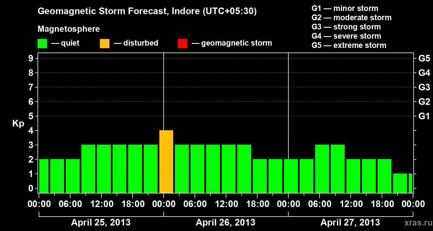 Geomagnetic storm forecast in Indore for Apr 25, 2013