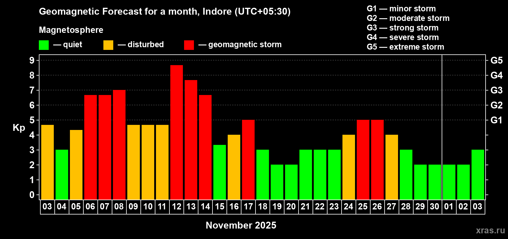 Geomagnetic storm forecast in Indore for Nov 03, 2025