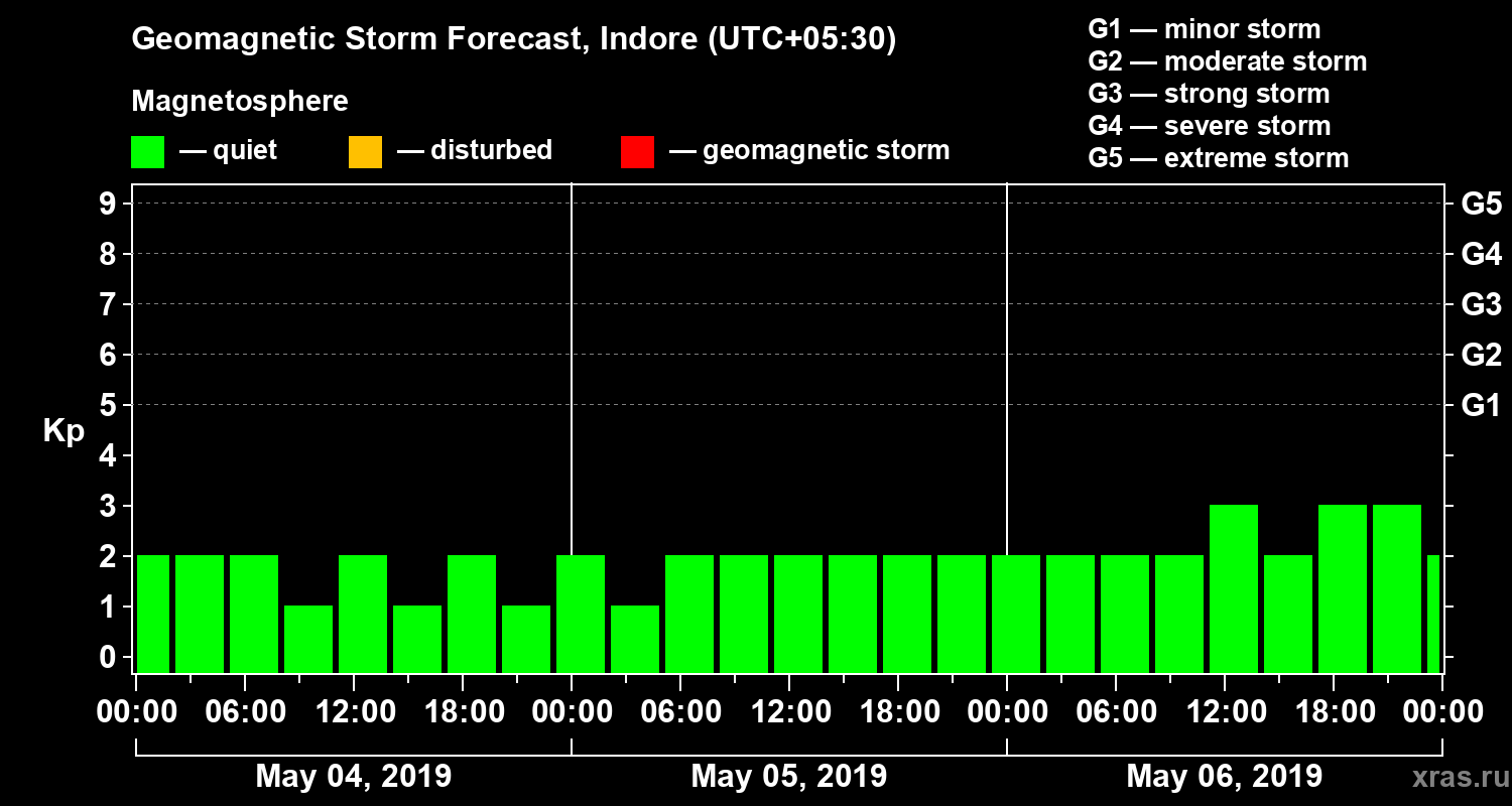 Geomagnetic storm forecast in Indore for May 04, 2019