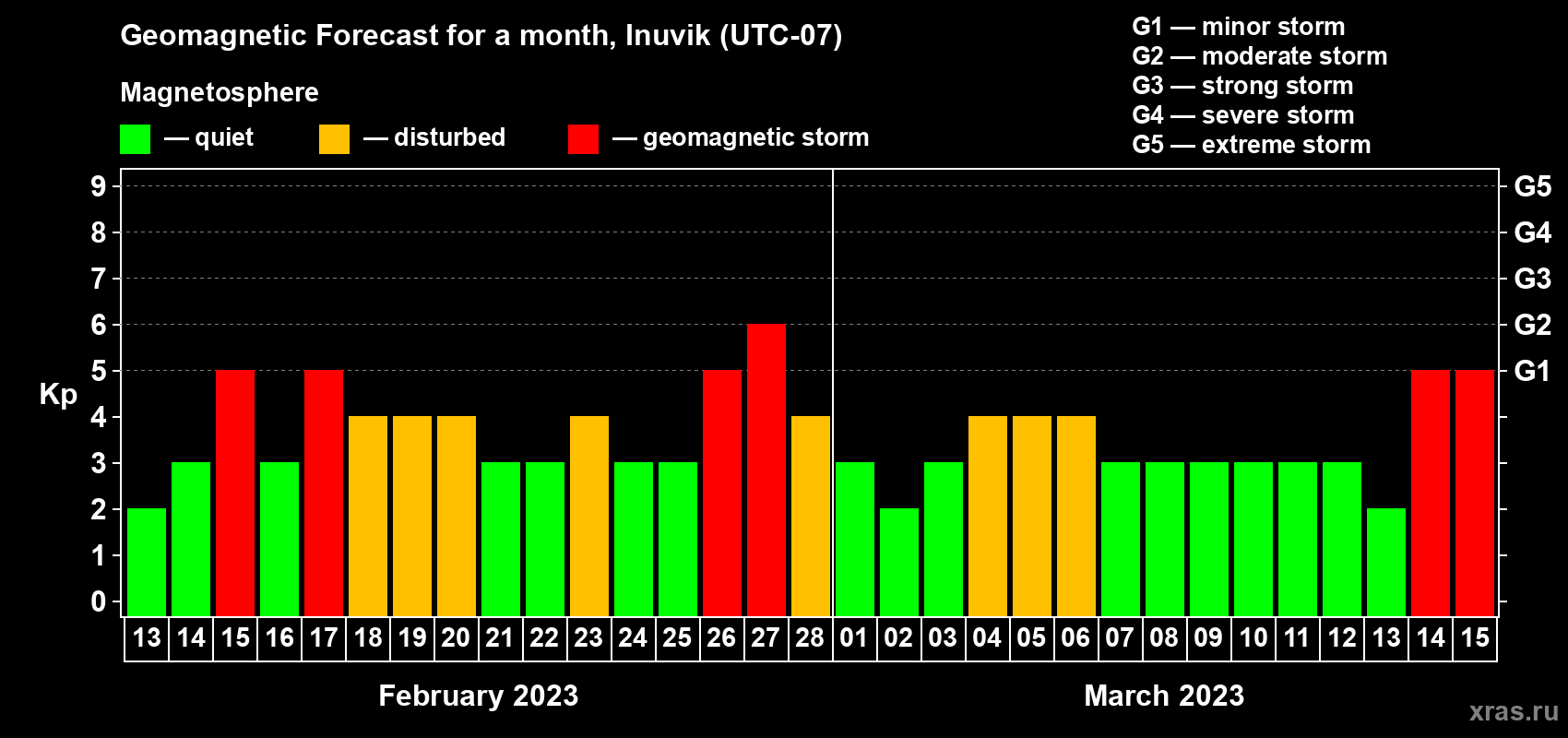 Geomagnetic storm forecast in Inuvik for Feb 13, 2023