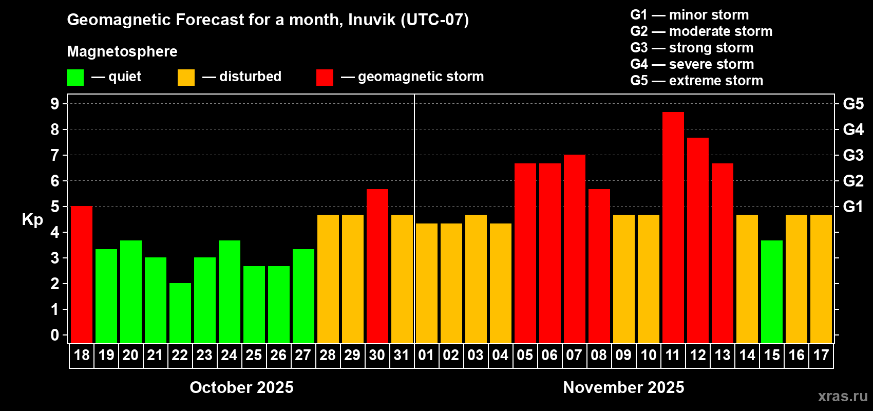Geomagnetic storm forecast in Inuvik for Oct 18, 2025