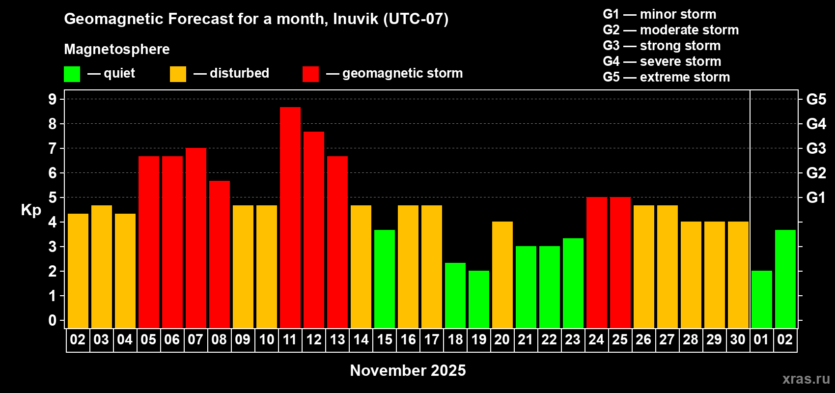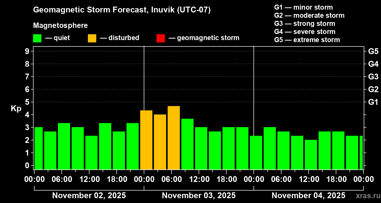 Geomagnetic storm forecast in Inuvik for Nov 02, 2025
