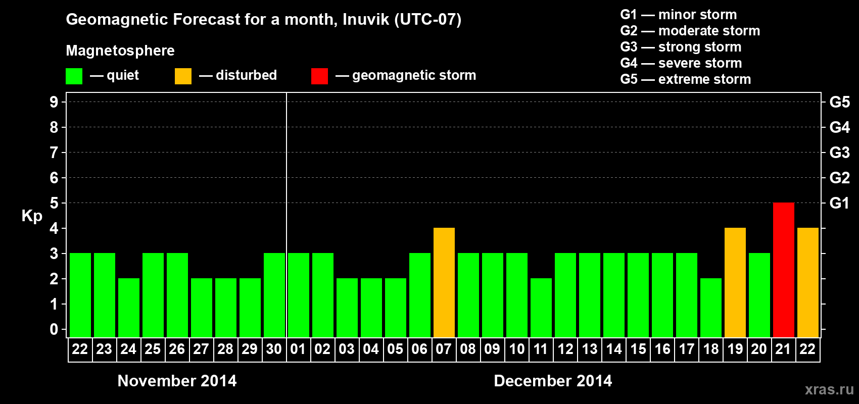 Geomagnetic storm forecast in Inuvik for Nov 22, 2014