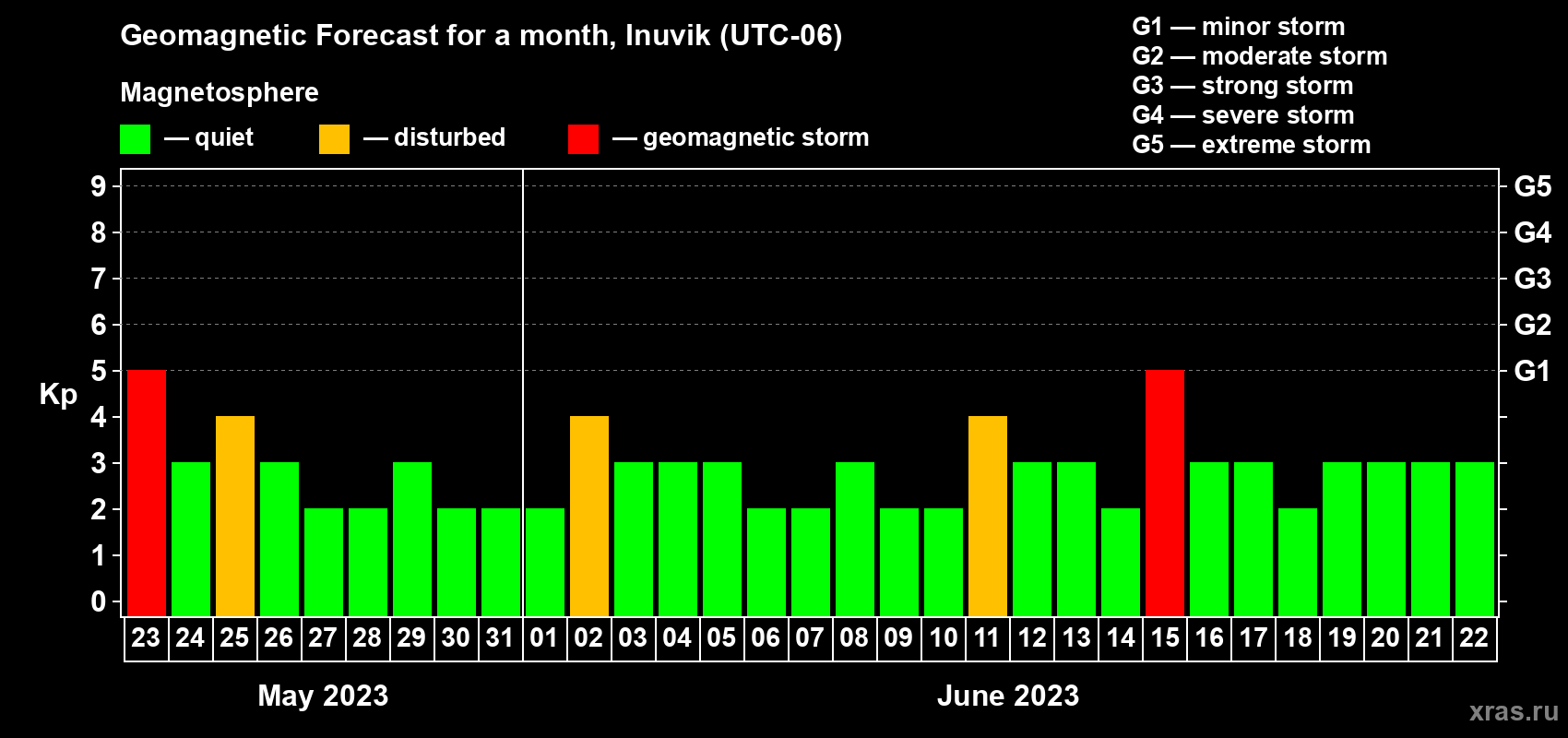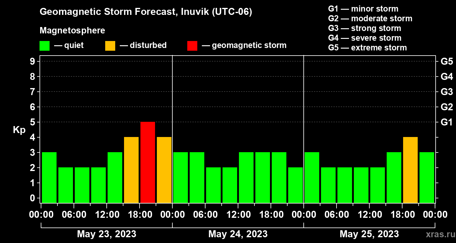 Geomagnetic storm forecast in Inuvik for May 23, 2023