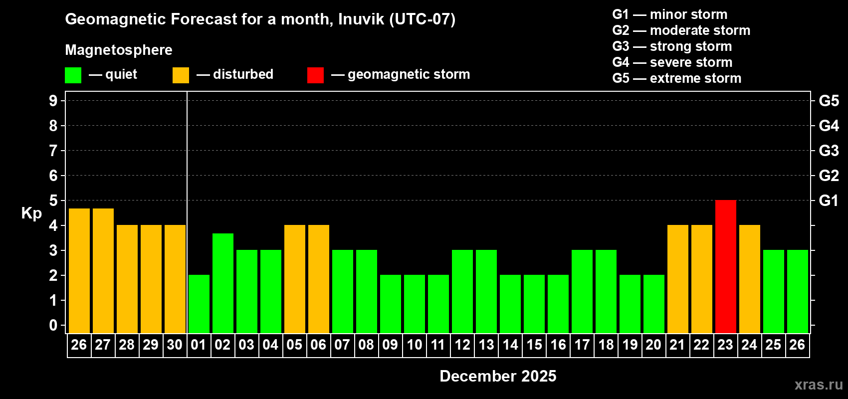 Geomagnetic storm forecast in Inuvik for Nov 26, 2025