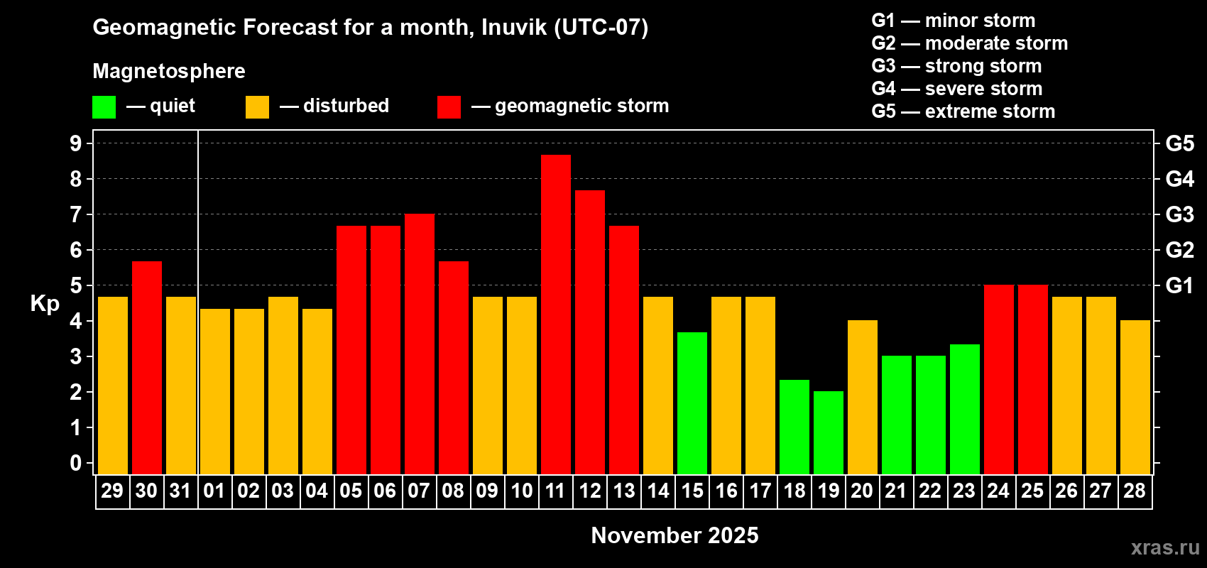 Geomagnetic storm forecast in Inuvik for Oct 29, 2025