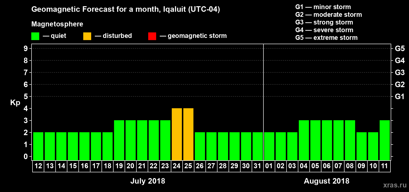 Geomagnetic storm forecast in Iqaluit for Jul 12, 2018