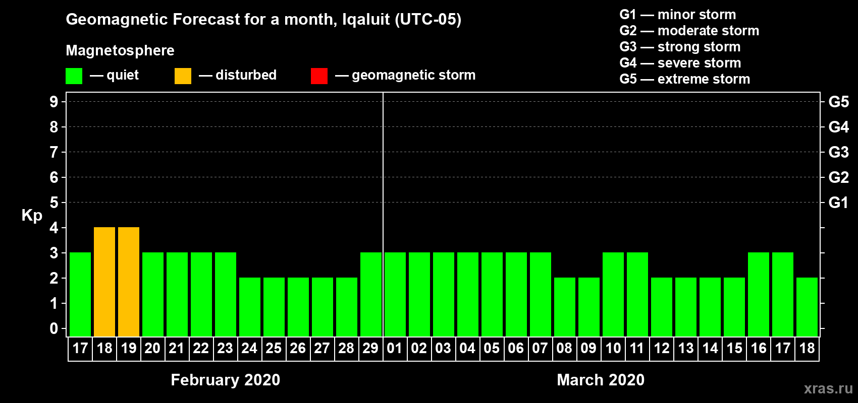 Geomagnetic storm forecast in Iqaluit for Feb 17, 2020