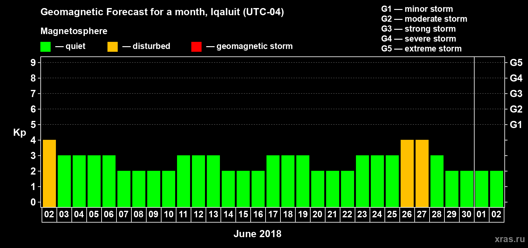 Geomagnetic storm forecast in Iqaluit for Jun 02, 2018