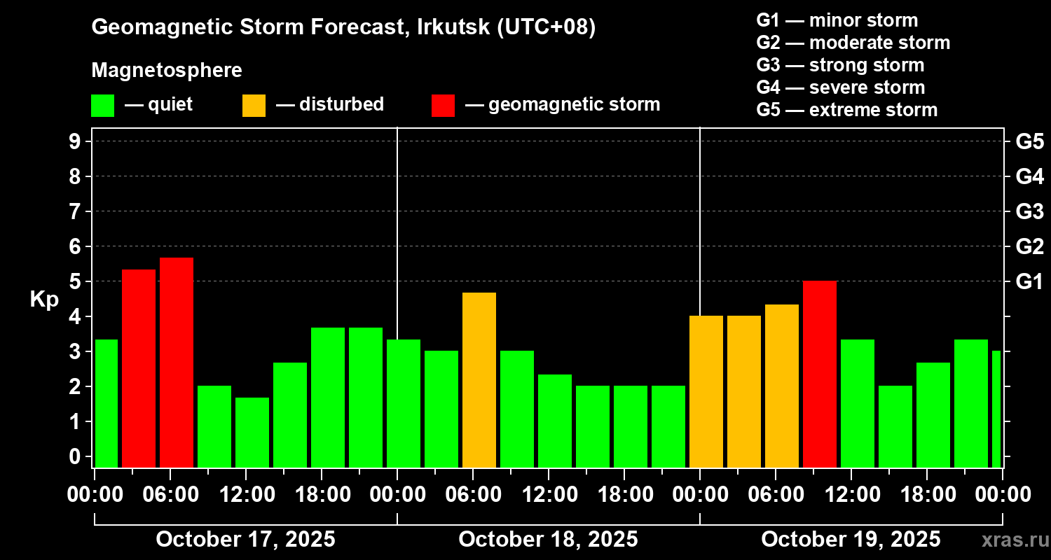 Geomagnetic storm forecast in Irkutsk for Oct 17, 2025