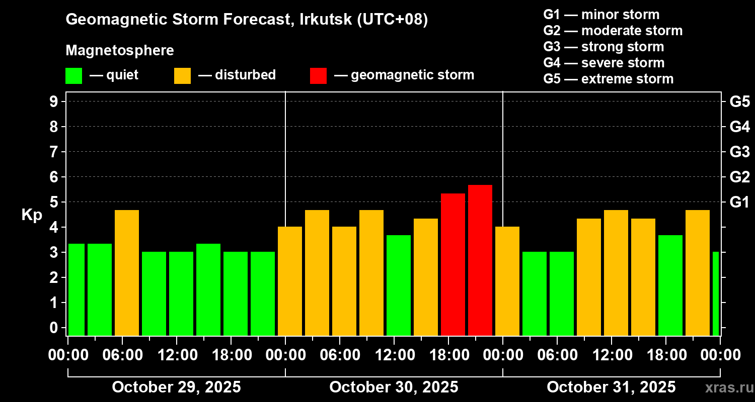 Geomagnetic storm forecast in Irkutsk for Oct 29, 2025