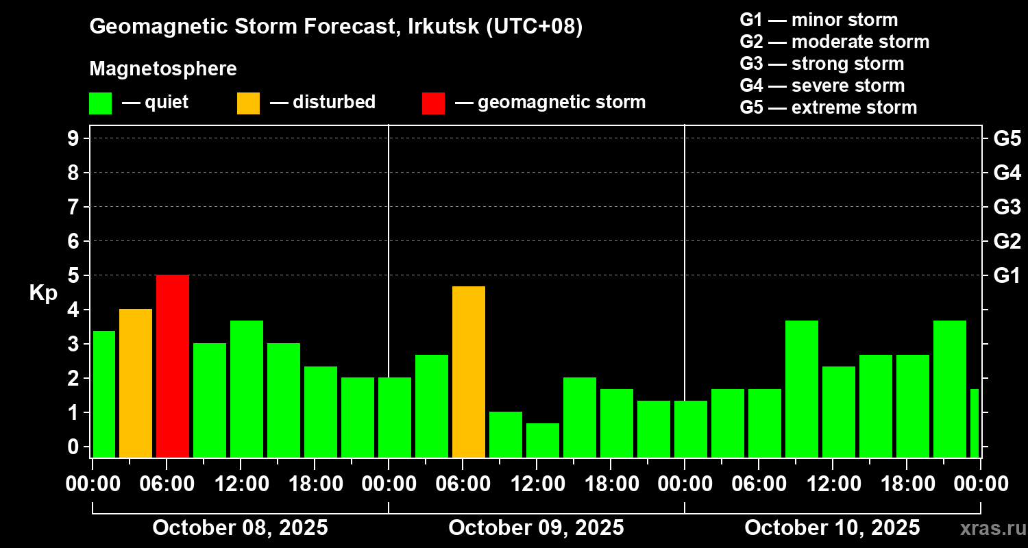 Geomagnetic storm forecast in Irkutsk for Oct 08, 2025