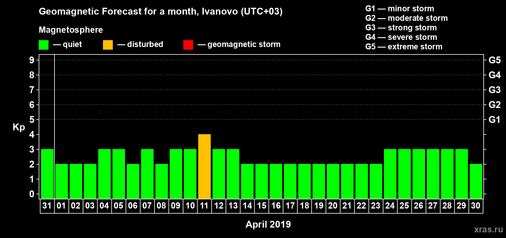 Geomagnetic storm forecast in Ivanovo for Mar 31, 2019