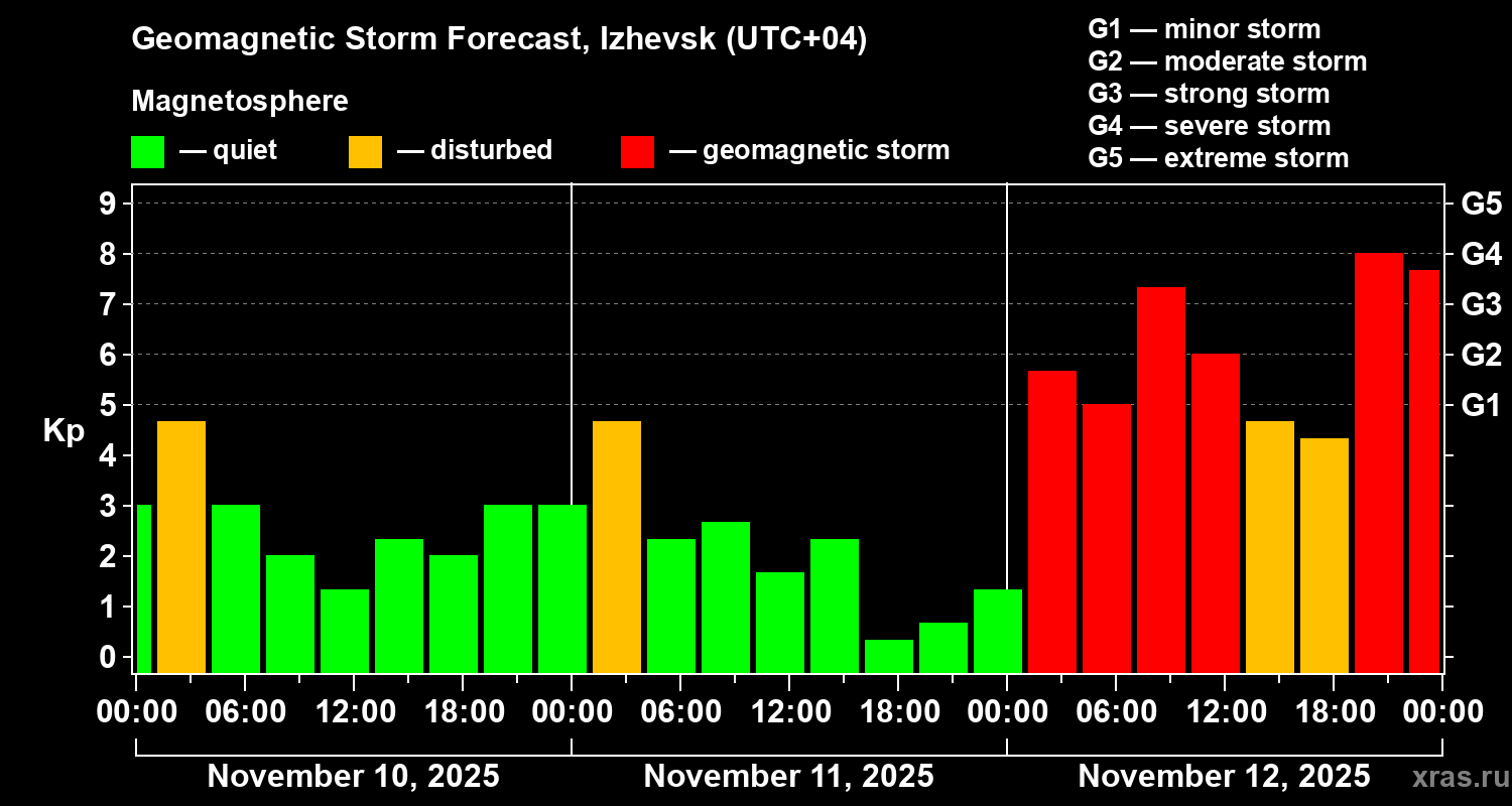 Geomagnetic storm forecast in Izhevsk for Nov 10, 2025