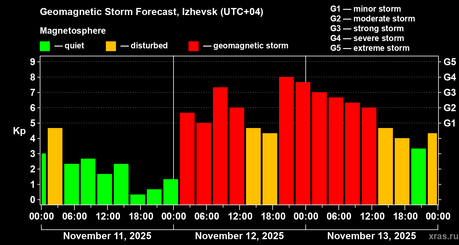 Geomagnetic storm forecast in Izhevsk for Nov 11, 2025